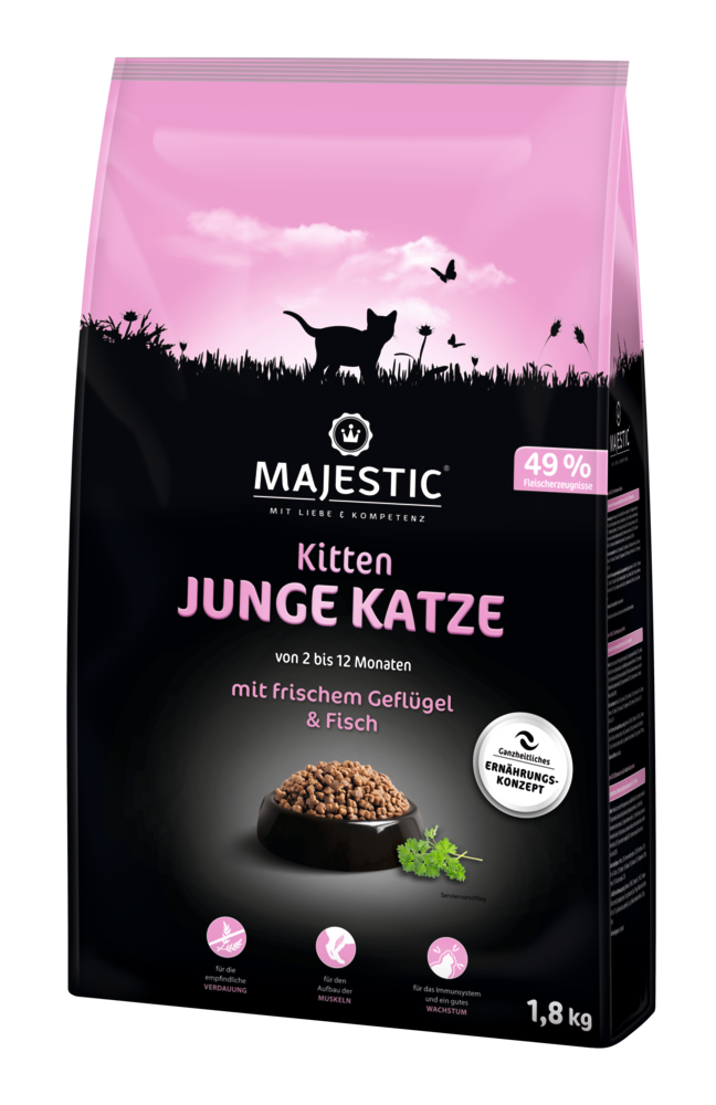 MAJESTIC ist eine vollwertige Hauptmahlzeit mit wertvollen Proteinquellen für eine optimale Entwicklung heranwachsender Kätzchen. MAJESTIC JUNGE KATZE unterstützt auf Grund seiner überdurchschnittlichen hohen Qualität in der Zusammensetzung und der vielen lebenswichtigen Nähr- und Wirkstoffen für eine optimale Entwicklung heranwachsender Kätzchen.