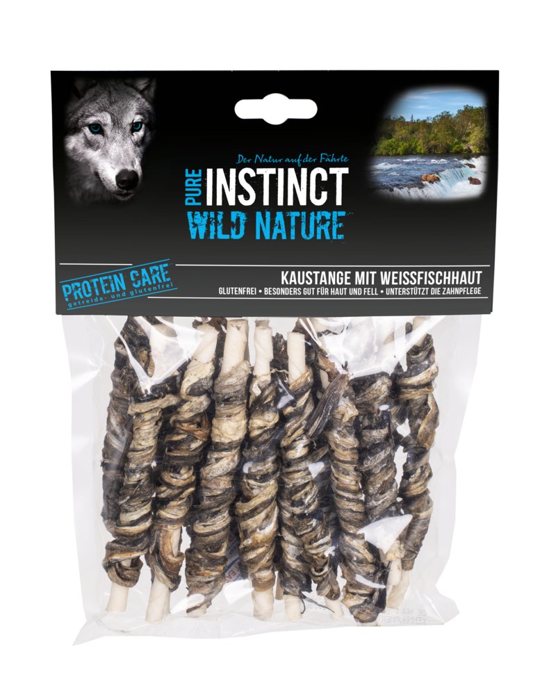 Diese köstlichen PURE INSTINCT® Kaustangen mit Weißfischhaut sind naturbelassen, schonend ofengetrocknet und auch für sensible Hunde und Tiere mit Allergien und Futtermittelunverträglichkeiten bestens geeignet. Sie sind frei von künstlichen Zusatzstoffen und bringen Abwechslung in den Napf für Hunde, die bewusst ernährt werden. Die Omega Fettsäuren im Fisch sind besonders gut für Haut und Fell.