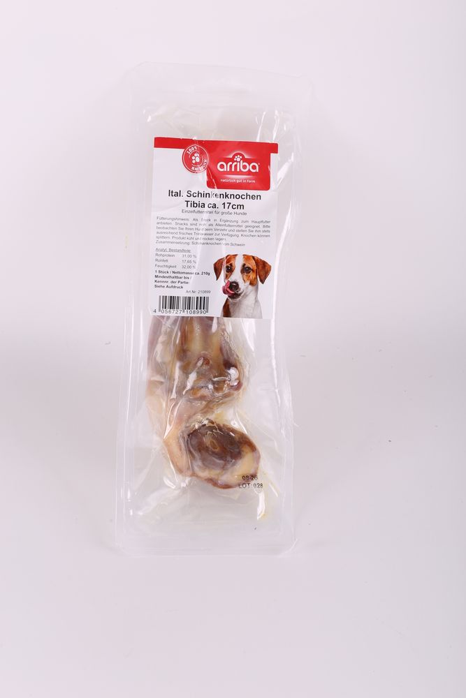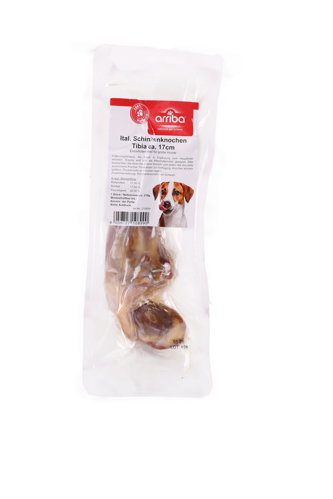 Dieser tolle Schinkenknochen der Marke arriba stammt von im Ganzen zu edlen Schinken verarbeiteten Schweinekeulen. Diese werden bis zu 24 Monate luftgetrocknet. Dadurch erhalten Schinkenfleisch und der Knochen sein einzigartiges Aroma. 19 cm Schinkenknochen für stundenlanges Kauvergnügen. Besonders für große und mittlere Hunde-Rassen geeignet. Sicher einzeln verpackt in einer Tüte, kommt dieser Italienische Schinken-Knochen zu Ihnen nach Hause. Es handelt sich um Schienbeinknochen vom Schwein.
