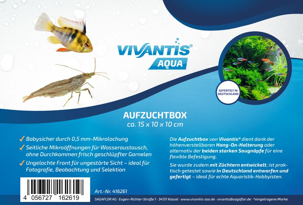 Die praktische Aufzuchtbox von Vivantis Aqua ermöglicht eine sichere Umgebung für Jungfische und frisch geschlüpfte Garnelen. Dank hochwertiger Verarbeitung und durchdachter Funktionen ist sie ideal für Aquaristik-Hobbyisten.Sie wurde mit Züchtern entwickelt, ist praktisch getestet sowie in Deutschland entworfen und gefertigt.