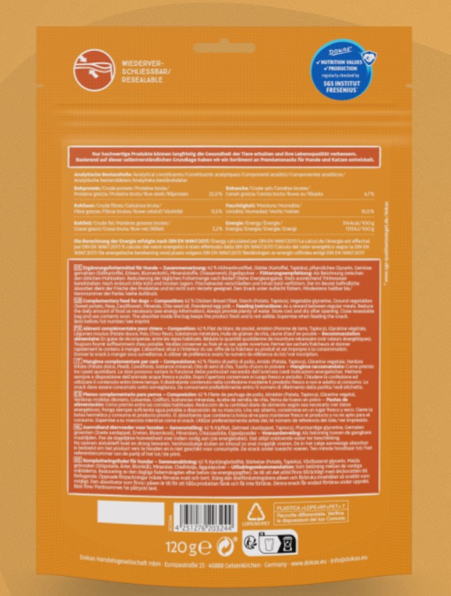 42 % Hühnerbrustfilet, Stärke (Süßkartoffel, Tapioka), pflanzliches Glycerin, Gemüse gemahlen (Süßkartoffel, Erbsen, Blumenkohl), Mineralstoffe, Chiasamenöl, Eigelbpulver