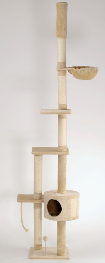 Der raumhohe Katzenkratzbaum Lucy bietet deiner Katze vielseitige Möglichkeiten zum Spielen, Klettern und Entspannen. Die mit Sisal umwickelten Holme fördern die Krallenpflege und lenken deinen Zimmertiger von Möbeln und Wänden ab. Nach aufregenden Klettertouren lädt die Kuschelmulde zum Entspannen ein, während die gemütliche Höhle mit integrierter Außenkratzfläche zusätzlichen Komfort bietet. Für noch mehr Spielspaß sorgen die Federspielkugel auf der Bodenplatte und das Spielseil.
