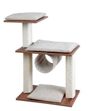 Pflegeleicht, moderne Optik und Bequemlichkeit für Ihre Zimmertiger. Die melaminbeschichteten Boden- (ca. 36x60 cm) und Liegeplatten (1x ca. 36x36 cm, 1x 36x60 cm) lassen sich feucht abwischen. Die mit Vlies gefüllten Kissen können mittels Klettband auf den Liegeplatten befestigt werden und sind bei 30 Grad waschbar. Die Massivholzholme (9x9 cm) sind mit Natursisal umwickelt. Eine Spielrolle (ca. Durchmesser 20 x Länge 30 cm) ist ein ideales Versteck.Lieferung erfolgt zerlegt mit Aufbauanleitung.