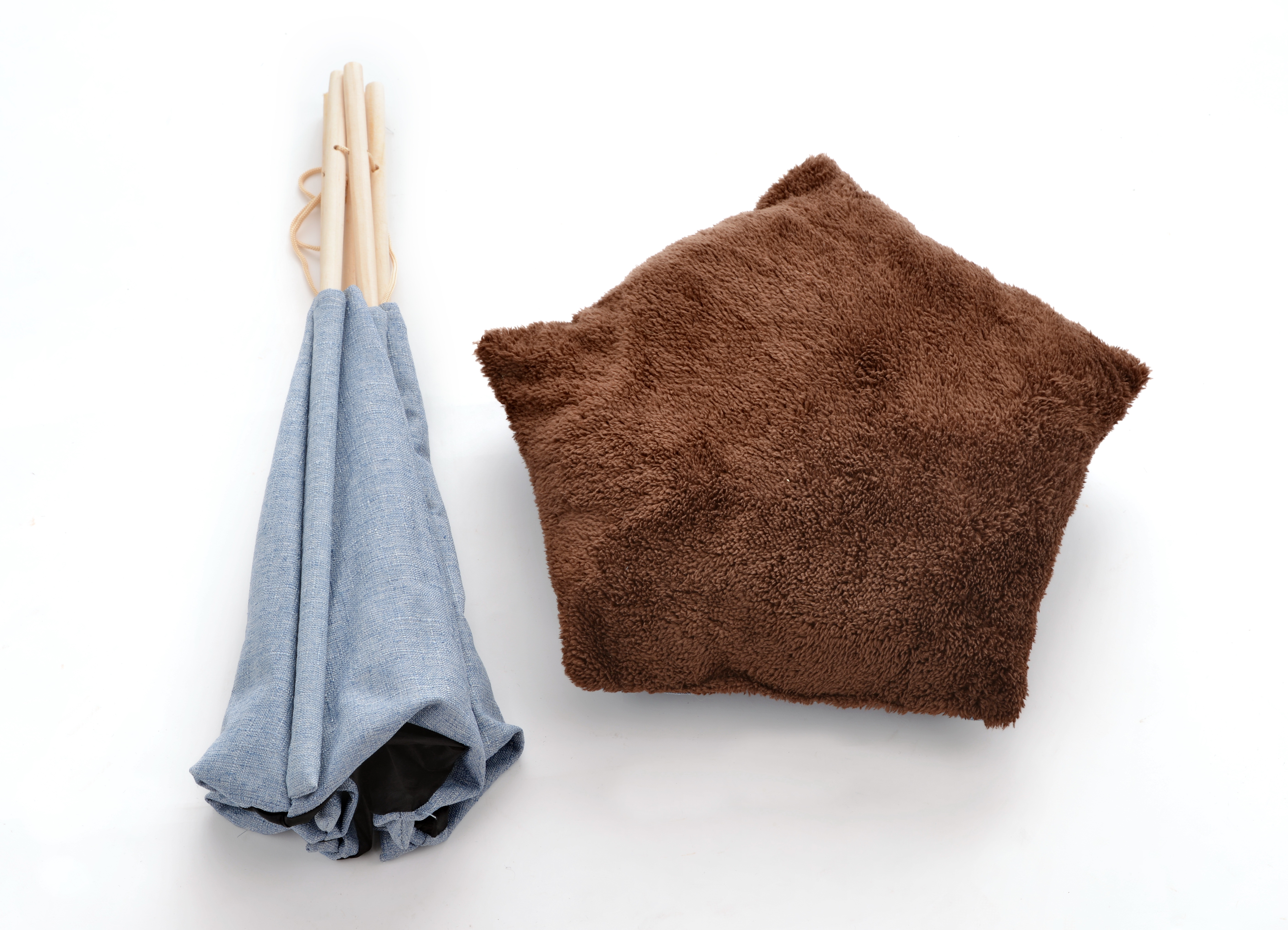 - Fünfeckige Tipi-Form mit fünf Holzstäben, oben verbunden durch ein Seil