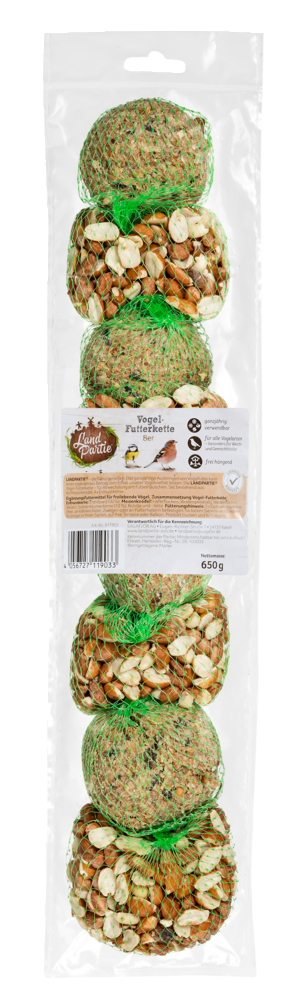 LANDPARTIE - die Natur genießen. Das ganzjährige Ausbringen von Vogelfutter kann einen ergänzenden Beitrag zum Erhalt unserer Vogelvielfalt leisten. Die LANDPARTIE® Vogel-Futterkette - für Abwechslung am Futterhäuschen. Set bestehend aus: 4 x Meisenknödel, 4 x Erdnusskerne.
