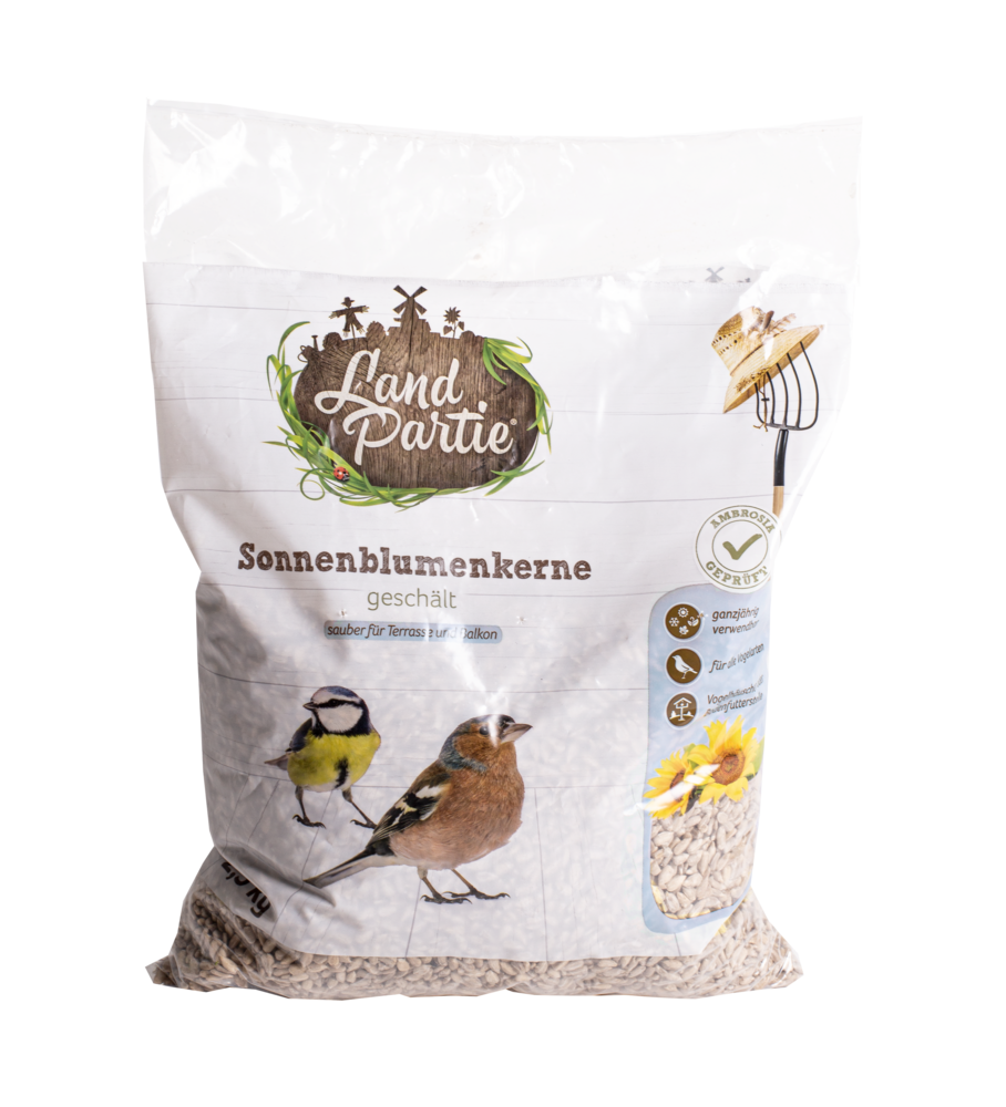 In der heutigen Zeit ist der Lebensraum von freilebenden Vögeln häufig nicht mehr artenreich genug, um ihnen das Futter zu bieten, das sie für sich und die Aufzucht ihrer Jungen benötigen. Das ganzjährige Ausbringen von Vogelfutter kann somit einen ergänzenden Beitrag zum Erhalt unserer Vogelvielfalt leisten. Hochwertige schalenfreie Landpartie Sonnenblumenkerne sind eine nahrhafte und energiereiche Mahlzeit, die den Vögeln bei der Überwinterung hilft und sie das ganze Jahr über mit vielen natürlichen und wertvollen Nährstoffen versorgt. Ein echter Schnabel-Schmaus für freilebende Gartenvögel. Ohne Schalen wird das Futter vollständig gefressen und der Futterplatz bleibt sauber - ideal zur Balkon- und Terrassenfütterung geeignet.- ganzjährig verwendbar