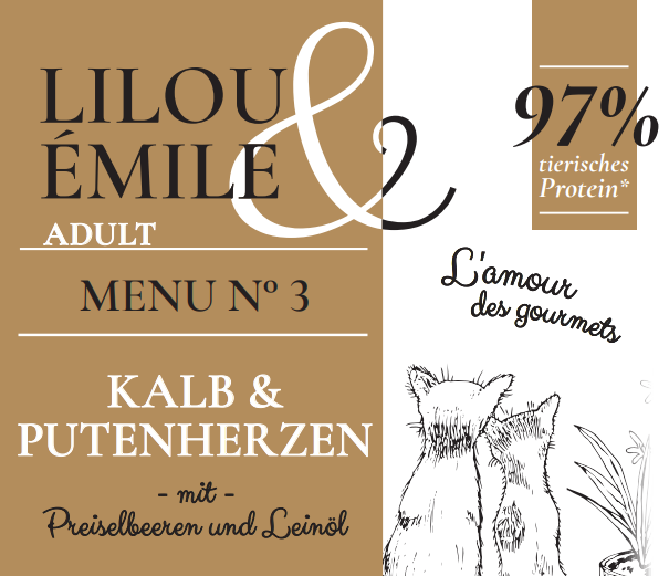 Herzlich willkommen in der kulinarischen Welt von Lilou & Émile!Lilou & Émile ist ein hochwertiges Futtermittel für Katzen und überzeugt mit erlesenen Zutaten. Tauchen Sie mit unseren köstlichen Menus ein in die Haute Cuisine Frankreichs und schwelgen Sie in den Genüssen. Feines Fleisch wird mit ausgewählten Ingredienzen wie Preiselbeeren, dem Extrakt der Grünlippmuschel und Leinsaat zubereitet.