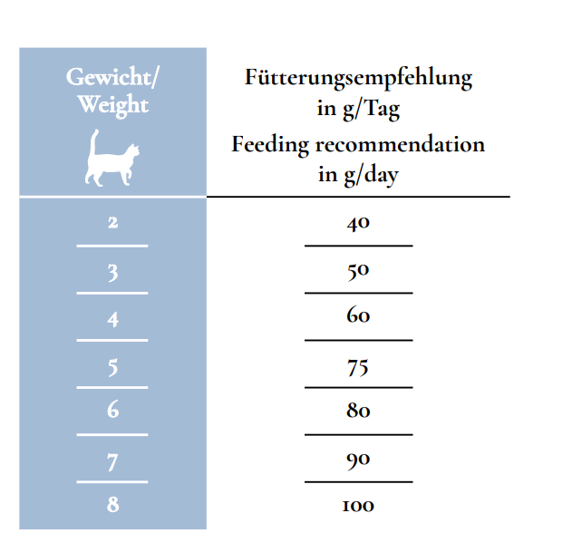| Gewicht der Katze | Fütterungsempfehlung g pro Tag |