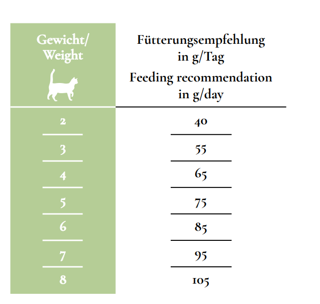 | Gewicht der Katze | Fütterungsempfehlung g pro Tag |
