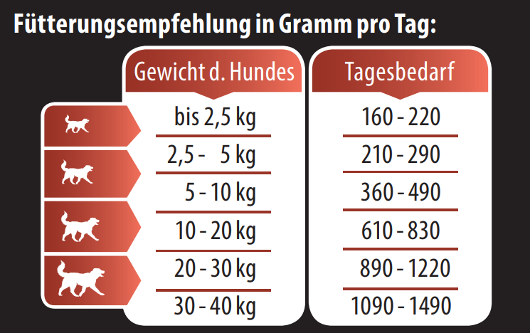 Bei der Fütterungsempfehlung handelt es sich um Circa-Richtwerte für den Tagesbedarf, die für die bedarfsgerechte Versorgung ausgewachsener, normal aktiverHunde berechnet sind. Rasse, Alter, Aktivität und Haltungsbedingungen sind Faktoren, welche die angegebenen Fütterungsmengen stark beeinflussen können. Bitte zimmerwarm füttern und immer ausreichend frisches Trinkwasser bereitstellen. Wir empfehlen, den Tagesbedarf in 2 - 3 Mahlzeiten anzubieten. Nach dem Öffnen bitte kühl aufbewahren.