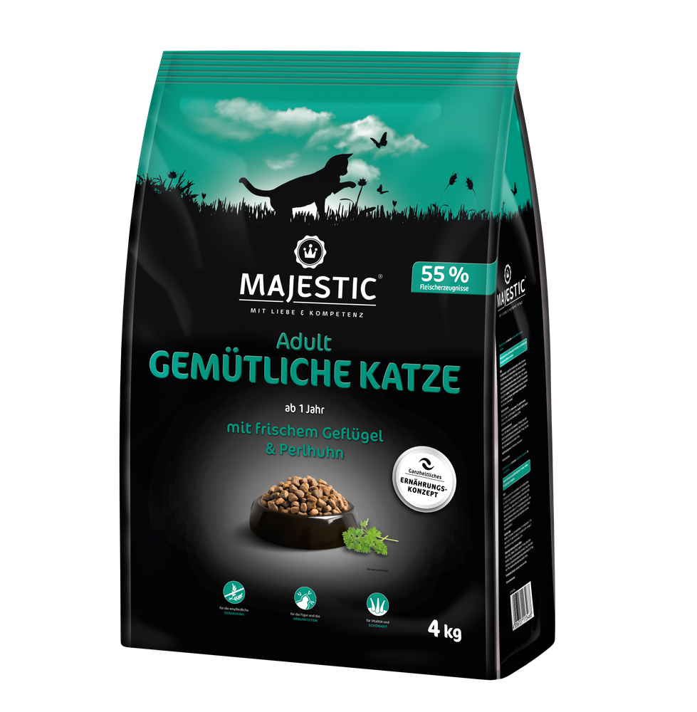 MAJESTIC ist eine vollwertige Hauptmahlzeit mit wertvollen Proteinquellen für eine optimale Ernährung ausgewachsener Katzen. Eine Katze, die ausschließlich zu Hause lebt, verbringt viel Zeit mit Schlafen und Fressen. Ihr Energiebedarf ist deutlich geringer als bei einer Katze, die draußen lebt. Weniger Bewegung führt oft zu unerwünschten Gewichtszunahmen und bei der Verdauung zu unangenehmem Stuhlgeruch. Mit MAJESTIC GEMÜTLICHE KATZE können sie diese lästigen Begleiterscheinungen deutlich reduzieren.