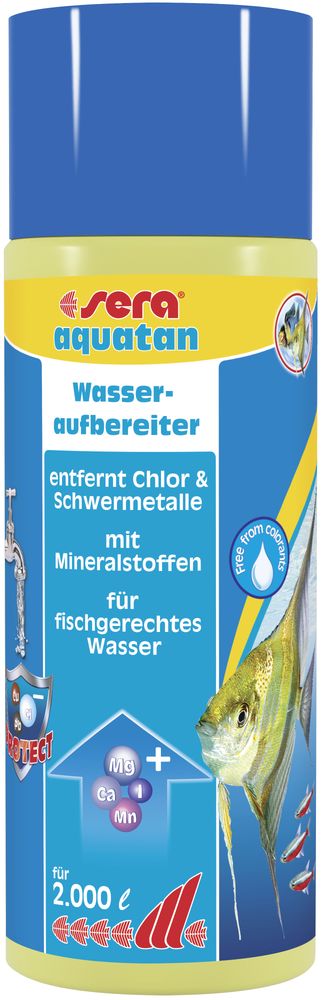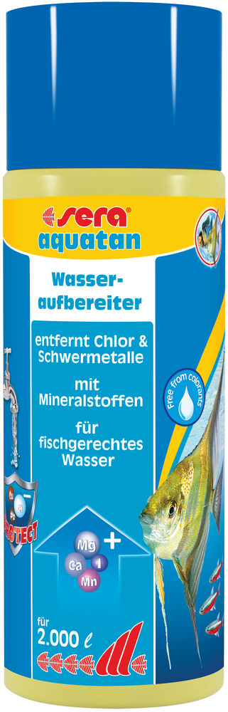 Die Fische fühlen sich in dem naturgerechten, gesunden, klaren Wasser sichtbar wohler. So macht die Aquarienpflege weniger Arbeit und richtig Spaß. Leitungswasser ist für Lebewesen in Aquarien keine geeignete Lebensgrundlage. Zusätze, die Leitungswasser für uns Menschen genießbar machen, schaden Fischen und Mikroorganismen in der Unterwasserwelt. sera aquatan mit der neuen Bio-Protect Formula beseitigt die Schadstoffe zuverlässig und bereitet Leitungswasser bei Neueinrichtung und Wasserwechsel jetzt noch fisch- und pflanzengerechter auf. Dadurch werden die Lebensbedingungen für Fische, Pflanzen und Mikroorganismen im Aquarien deutlich verbessert. Die Fische leuchten in ihren schönsten Farben. Die Aquarienpflege macht wenig Arbeit.Gesünderes, fischgerechteres Aquarienwasser durch die neue sera Bio-Protect Formula