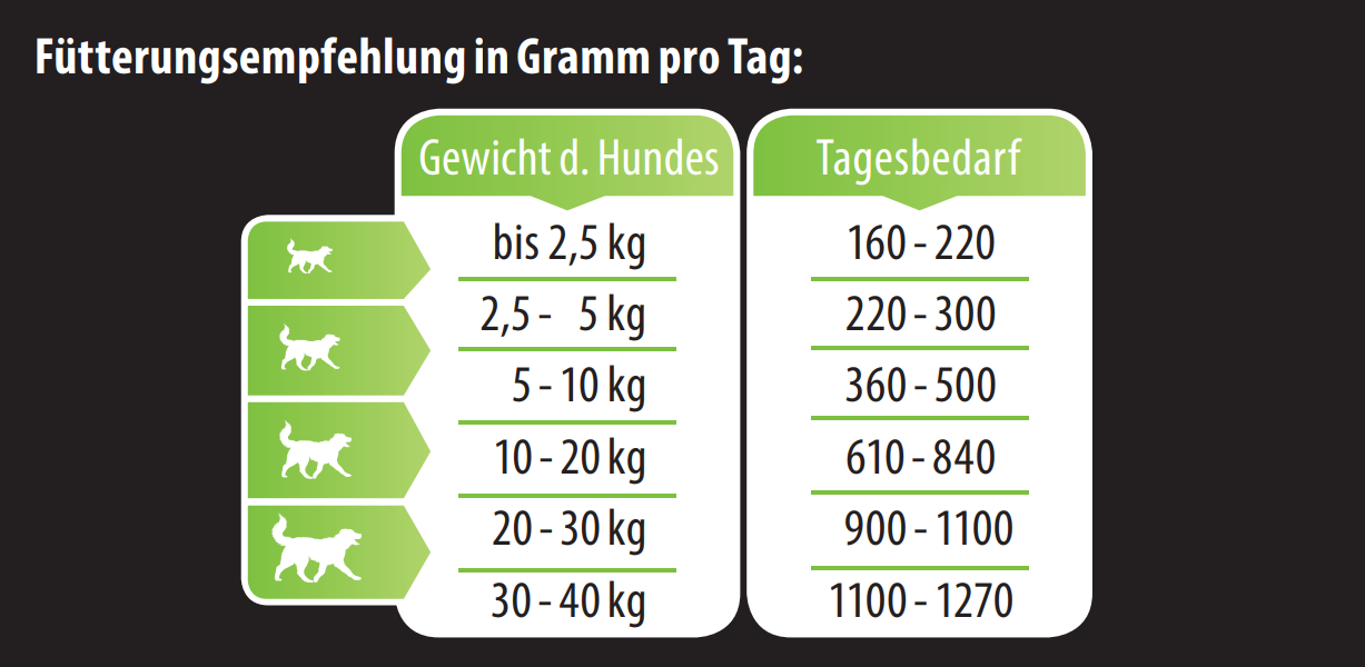 Bei der Fütterungsempfehlung handelt es sich um Circa-Richtwerte für den Tagesbedarf, die für die bedarfsgerechte Versorgung ausgewachsener, normal aktiverHunde berechnet sind. Rasse, Alter, Aktivität und Haltungsbedingungen sind Faktoren, welche die angegebenen Fütterungsmengen stark beeinflussen können. Bitte zimmerwarm füttern und immer ausreichend frisches Trinkwasser bereitstellen. Wir empfehlen, den Tagesbedarf in 2 - 3 Mahlzeiten anzubieten. Nach dem Öffnen bitte kühl aufbewahren.