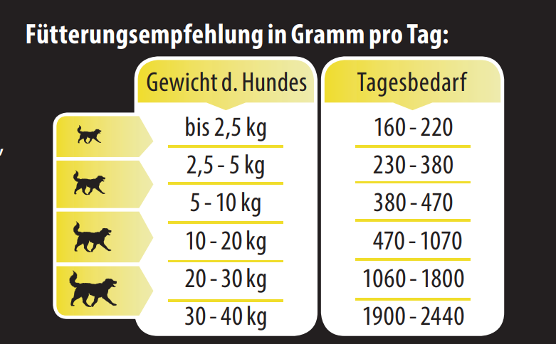 Bei der Fütterungsempfehlung handelt es sich um ca.- Richtwerte für den Tagesbedarf, die für die bedarfsgerechte Versorgung ausgewachsener, normal aktiver Hunde berechnet sind. Rasse, Alter, Aktivität und Haltungsbedingungen sind Faktoren, welche die angegebenen Fütterungsmengen stark beeinflussen können. Bitte zimmerwarm füttern und immer aus reichend frisches Trinkwasser bereitstellen. Nach dem Öffnen bitte kühl aufbewahren