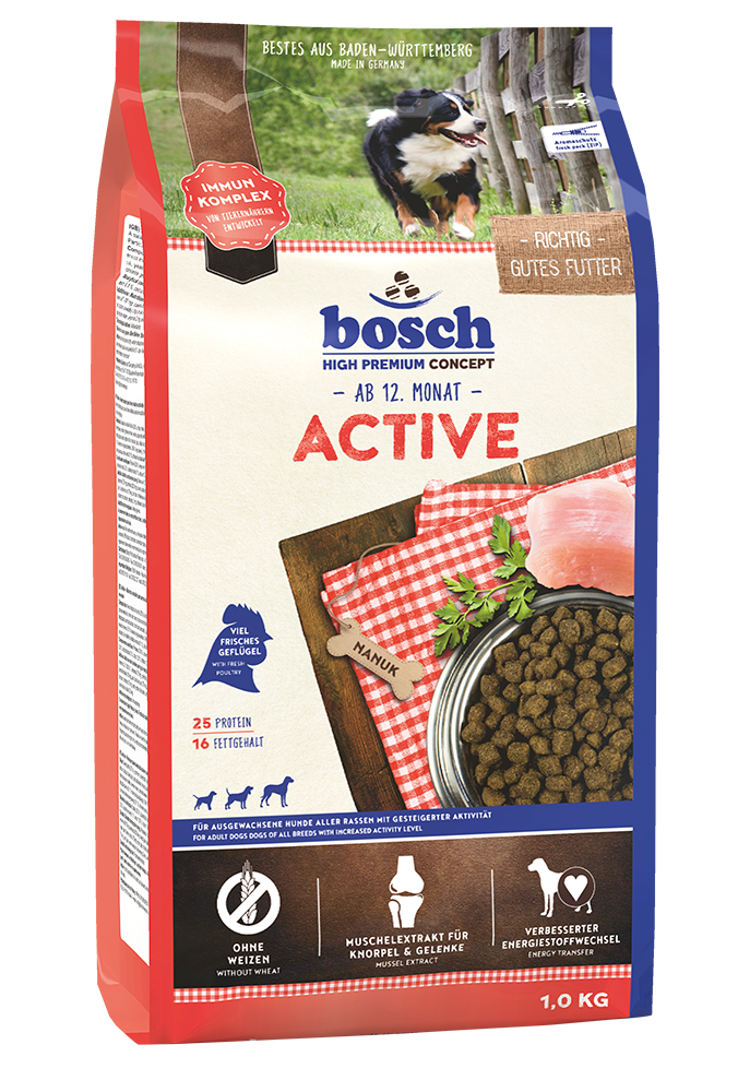 ACTIVE ist ideal für erwachsene Hunde mit erhöhtem Energiebedarf zur Unterstützung der optimalen Ausdauer und Leistungsfähigkeit (z. B. Hunde im Wach- & Schutzdienst, Sporthunde, usw.). ACTIVE enthält einen hohen Anteil an frischem Geflügel (min. 25 %) als hochwertige tierische Eiweißquelle und wird ohne Weizen hergestellt. Durch den Einsatz unseres Immun-Komplexes aus Mannanen & Glucanen wird die Darmflora stabilisiert, sowie das Immunsystem gestärkt. Knorpel & Gelenke werden durch die enthaltenen Muschelextrakte unterstützt.- mit viel frischem Geflügel (min. 25 %)
