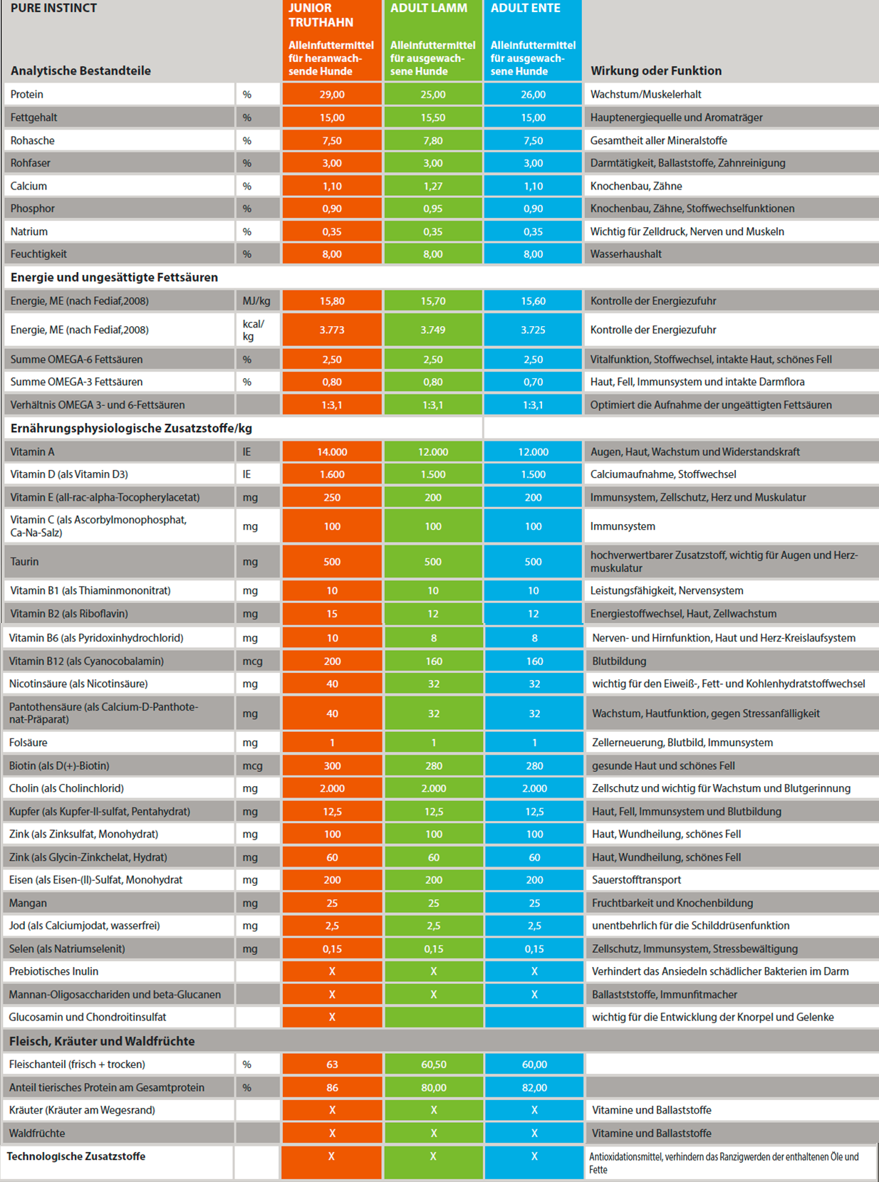 In der freien Natur leben Wölfe häufig im Rudel, das gemeinsam Beutetiere wie Lamm, Geflügel, Ziegen oder Wild jagt, sich gegenseitig schützt, zusammen die jungen Wölfe aufzieht und Ihnen das Jagen beibringt. Bei Untersuchungen wurden im Magen des Wolfes außer Fleisch auch Wurzeln, Wildkräuter und Beeren gefunden. Die züchterische Bearbeitung des Wolfes, zu mehr als 400 Hunderassen, hat zwar Größen, Formen, Farben und gar Teile des Verhaltens verändert, nicht jedoch den Bau und die Funktion des Verdauungstraktes. Bei der Entwicklung von PURE INSTINCT hatten wir das Ziel, uns auf "die Fährte der Natur" zu begeben und haben diese ursprünglichen Zutaten in der Zusammensetzung verwendet. PURE INSTINCT ist getreidefrei - damit auch die Hunde PURE INSTINCT fressen können, die an einer Getreideunverträglichkeit leiden. Entdecken sie weitere leckere Geschmacksrichtungen in unserem Shop.