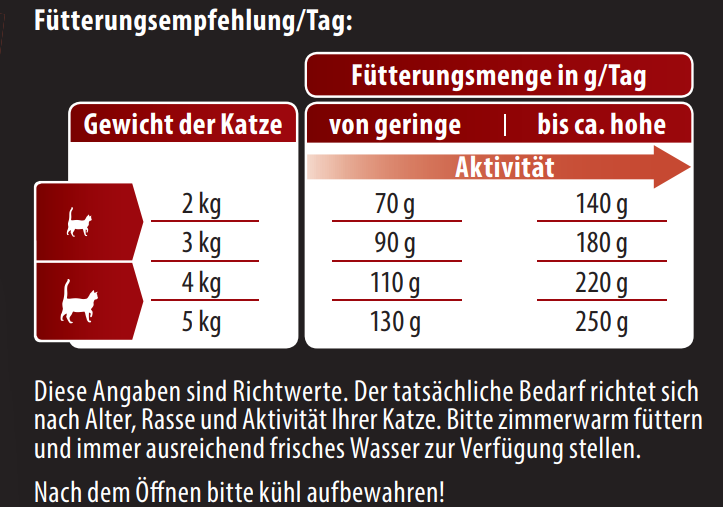 Die richtige Menge an Futter hängt von der Größe, dem Gewicht und dem Aktivitätslevel Ihrer Katze ab.
