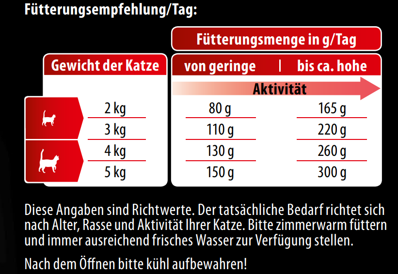 Diese Angaben sind Richtwerte. Der individuelle Bedarf hängt von Faktoren wie Alter, Rasse, Gewicht und Haltungsbedingungen ab. Bei gesteigerter Aktivität Futtermenge bitte entsprechend erhöhen. Bitte stets ausreichend frisches Trinkwasser bereitstellen.