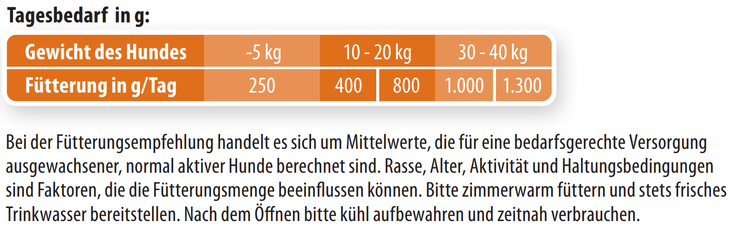 Bei der Fütterungsempfehlung handelt es sich um Mittelwerte, die für eine bedarfsgerechte Versorgung ausgewachsener, normal aktiver Hunde berechnet sind. Rasse,