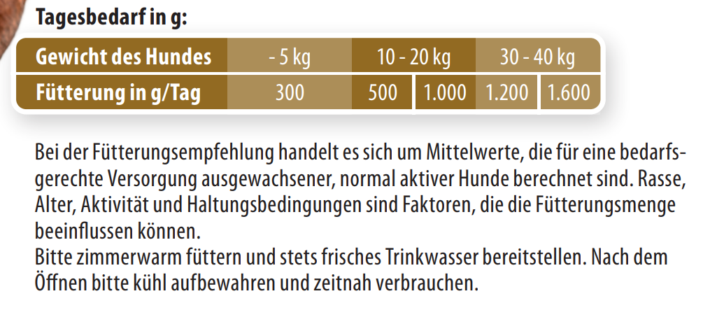 Bei der Fütterungsempfehlung handelt es sich um Mittelwerte, die für eine bedarfsgerechte Versorgung ausgewachsener, normal aktiver Hunde berechnet sind. Rasse,