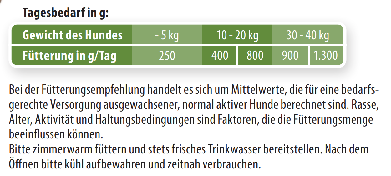 Bei der Fütterungsempfehlung handelt es sich um Mittelwerte, die für eine bedarfsgerechte Versorgung ausgewachsener, normal aktiver Hunde berechnet sind. Rasse,