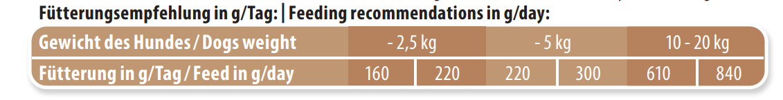 Bei der Fütterungsempfehlung handelt es sich um Mittelwerte, die für eine bedarfsgerechte Versorgung heranwachsender, normal aktiver Hunde berechnet sind. Rasse, Alter, Aktivität und Haltungsbedingungen sind Faktoren, die die Fütterungsmenge beeinflussen können. Es wird empfohlen, die Futtermenge in mehrere kleine Portionen aufzuteilen. Bitte zimmerwarm füttern und stets frisches Trinkwasser bereitstellen. Nach dem Öffnen bitte kühl aufbewahren und zeitnah verbrauchen.