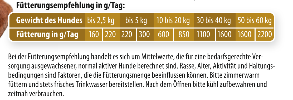 Bei der Fütterungsempfehlung handelt es sich um Mittelwerte, die für eine bedarfsgerechte Versorgung heranwachsender, normal aktiver Hunde berechnet sind. Rasse, Alter, Aktivität und Haltungsbedingungen sind Faktoren, die die Fütterungsmenge beeinflussen können. Es wird empfohlen, die Futtermenge in mehrere kleine Portionen aufzuteilen. Bitte zimmerwarm füttern und stets frisches Trinkwasser bereitstellen. Nach dem Öffnen bitte kühl aufbewahren und zeitnah verbrauchen.