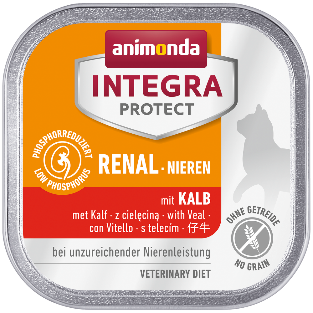 INTEGRA PROTECT Renal wurde speziell für Katzen mit chronischer Niereninsuffizienz entwickelt. Die deutlich geringere Zufuhr von Eiweißen verringert die auszuscheidene Menge an Eiweißabbauprodukten. Die gleichzeitige Reduzierung des Phosphorgehaltes verzögert den fortschreitenden Verlust der Nierenfunktion. Dadurch verbessert sich das Befinden der Katze nachhaltig und die Lebenserwartung kann verlängert werden. Diese Diätnahrung wird ohne Getreide hergestellt und ist damit für Katzen mit einer Getreideallergie geeignet.- phosphorreduziert