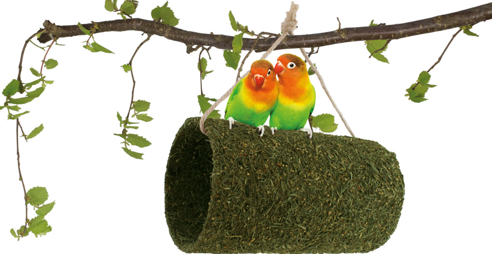 und verschiedenen Hirsekörnern. Aufgehängt bietet er den Vögeln Beschäftigung