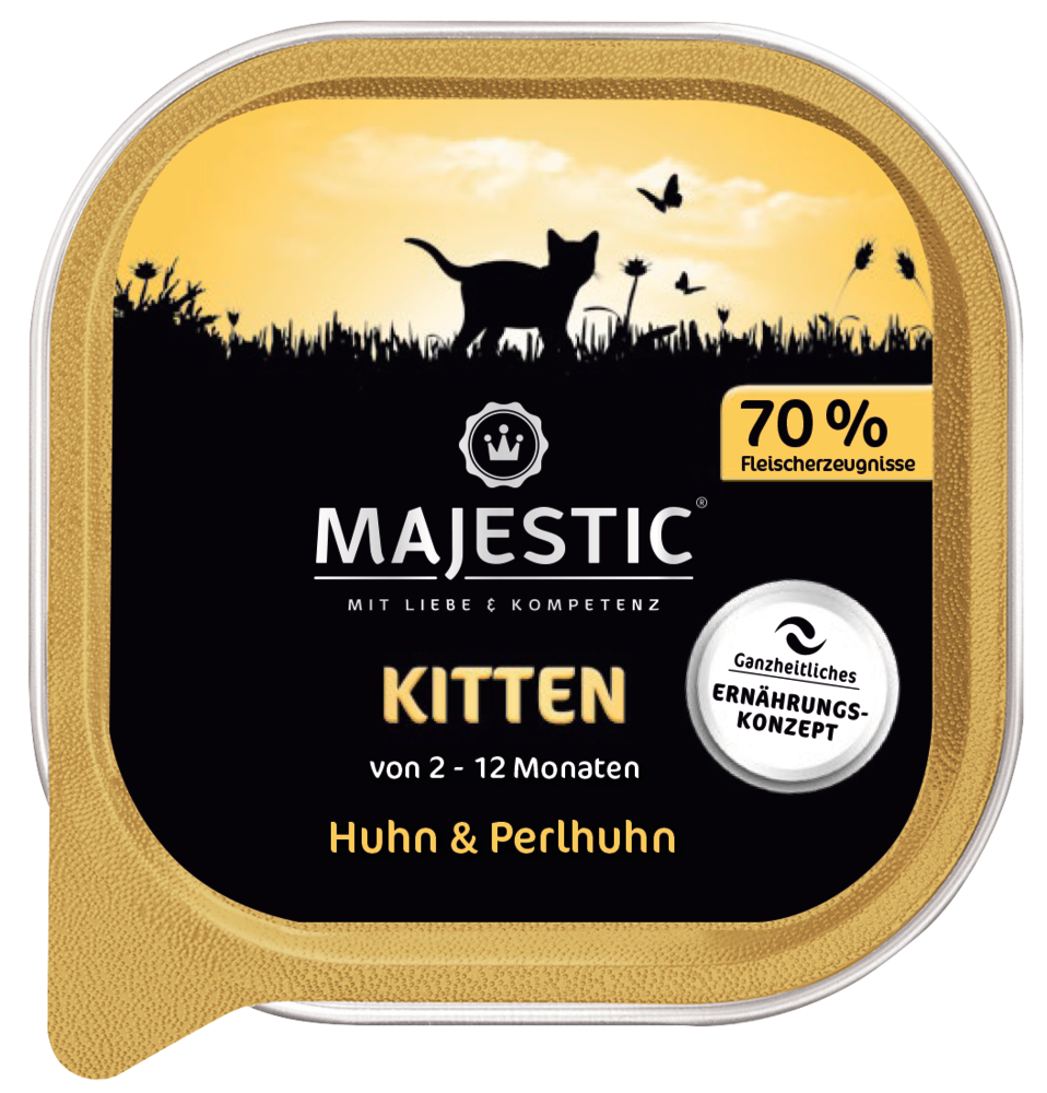 MAJESTIC ist eine vollwertige Hauptmahlzeit mit 70% Fleischerzeugnissen für eine optimale Entwicklung heranwachsender Kätzchen.Alle MAJESTIC-Produkte sind frei von künstlichen Farbstoffen, ohne Zuckerzusatz, ohne Soja und ohne gentechnisch veränderte Zutaten.