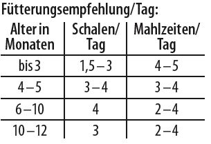 Diese Angaben sind Richtwerte. Der tatsächliche Bedarf richtet sich nach Alter, Rasse und Aktivität Ihres Kätzchens. Bitte immer ausreichend frisches Wasser zur Verfügung stellen.