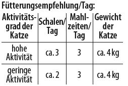 Der tatsächliche Bedarf richtet sich nach Alter, Rasse und Aktivität Ihres Kätzchens. Bitte immer ausreichend frisches Wasser zur Verfügung stellen.