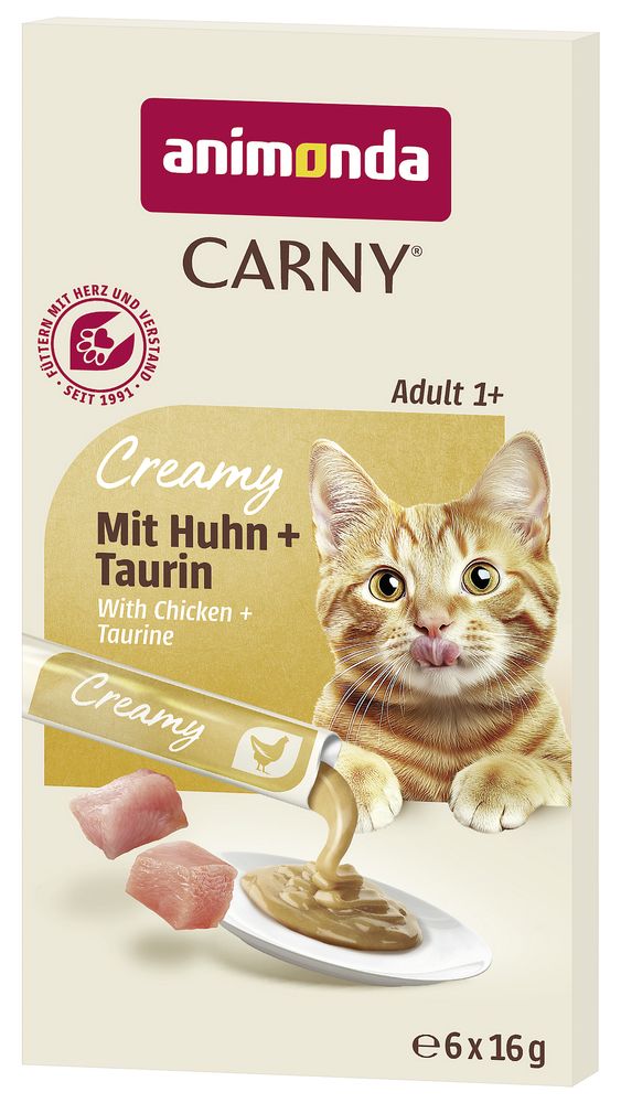 Die Produktneuheit CARNY® Creamy ist der besondere Genuss für zwischendurch. Mit dem cremigen Snack können Katzen jederzeit verwöhnt werden. CARNY Creamy mit bekömmlichem Huhn schmeckt nicht nur unwiderstehlich, sondern stellt dank des enthaltenen Taurins einen echten Nährstoff-Mehrwert für die Katze dar. Eine Schachtel enthält sechs einzelne Portionspackungen – für immer frischen Schleck-Genuss.- unverfälschter Genuss