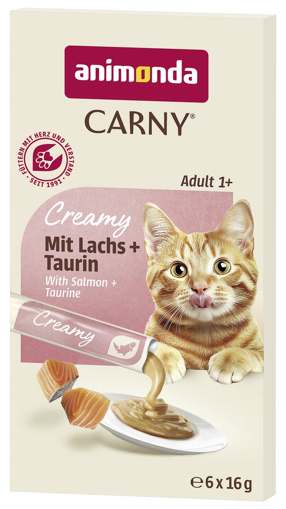 CARNY Creamy mit Lachs ist für tierische Fischfans eine wahre Delikatesse und dank enthaltenem Taurin stellt diese Variante einen echten Nährstoff-Mehrwert für die Katze dar.