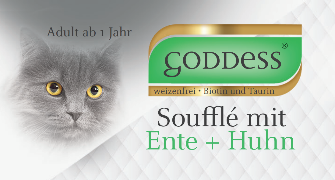 Alleinfuttermittel für ausgewachsene Katzen ab einem Jahr. GODDESS Soufflé mit feinem Huhn und Ente ist ein herrlich zartes Schlemmervergnügen, sowie Schönheit, Wohlbefinden und Verwöhnung pur.Tierart: Katze