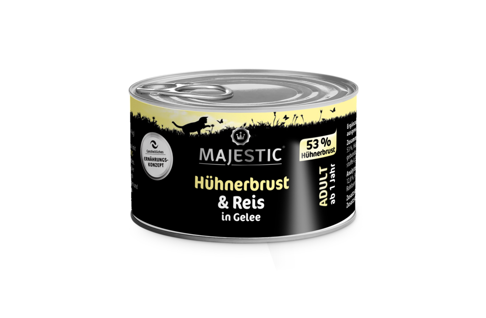 MAJESTIC Hühnerbrust & Reis wird aus vielen natürlichen Zutaten hergestellt. Der Erhalt der natürlichen Nährstoffe wird durch eine schonende Verarbeitung erzielt. Künstliche Farbstoffe, Konservierungsmittel, Zucker, Soja und gentechnisch veränderte Bestandteile sowie Geschmacksverstärker werden nicht zugesetzt. MAJESTIC Hühnerbrust & Reis behält durch die schonende Herstellung ihren ursprünglichen, echten Geschmack und wird mit delikatem Gelee verfeinert.