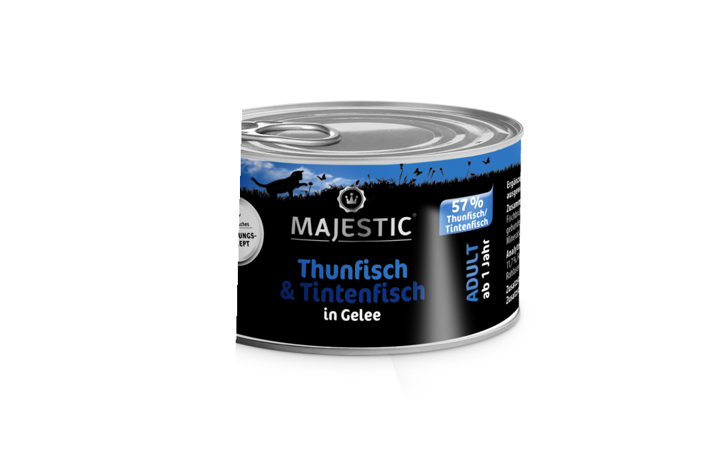 MAJESTIC Thunfisch & Tintenfisch wird aus vielen natürlichen Zutaten hergestellt. Es wird kein Zuchtfisch verarbeitet. Der Erhalt der natürlichen Nährstoffe wird durch eine schonende Verarbeitung erzielt. Künstliche Farbstoffe, Konservierungsmittel, Zucker, Soja und gentechnisch veränderte Bestandteile sowie Geschmacksverstärker werden nicht zugesetzt. MAJESTIC Thunfisch & Tintenfisch behält durch die schonende Herstellung ihren ursprünglichen, echten Geschmack und wird mit delikatem Gelee verfeinert.