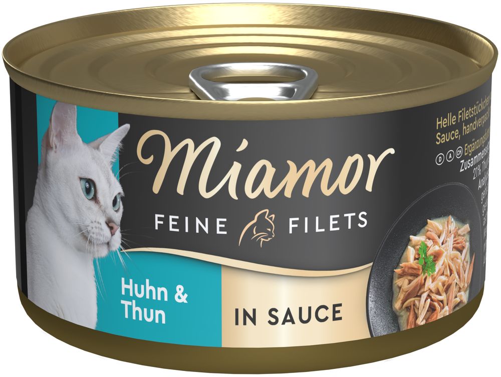 Ausschließlich helle Filetstückchen vom Huhn in Sauce, handverpackt mit hochwertigen Zutaten. Eine Filet-Spezialität auf höchstem Niveau - besonders leicht verdaulich, für die anspruchsvolle Katze. Auch für ältere und übergewichtige Katzen.- ausschließlich helles Filet vom Huhn und Thun in Sauce