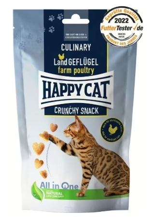 Der schmackhafte Crunchy Snack Land-Geflügel von Happy Cat mit zartem Huhn garantiert Verwöhnmomente für Samtpfoten. Das enthaltene HAPPY CAT All in One Concept deckt mit der innovativen Wirkstoffformel die fünf wichtigsten gesundheitlichen Bedürfnisse ab und bietet alles für ein vitales Katzenleben.Tierart: Katze