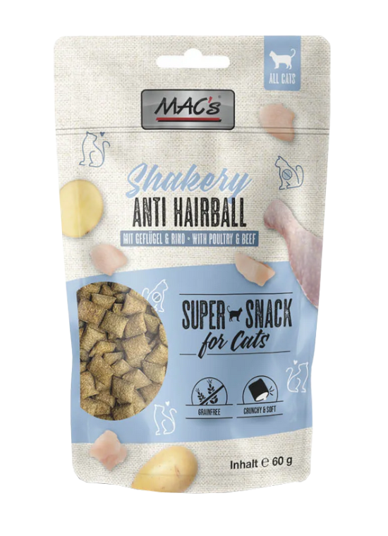 MAC´s Shakery Anti Hairball sind ein schmackhafter Leckerbissen für deine Katze.Außen knusprig und mit einer zart-cremigen Geflügel und Rind Füllung