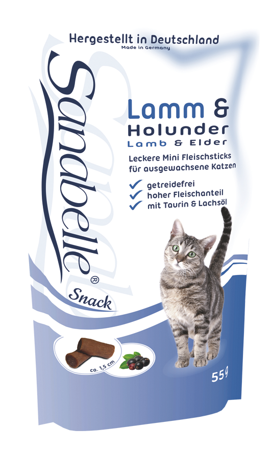 Sanabelle Katzensnack Lamm und Holunder sind kurz abgeschnittene, getreidefreie Sticks mit sehr hohem Fleischanteil