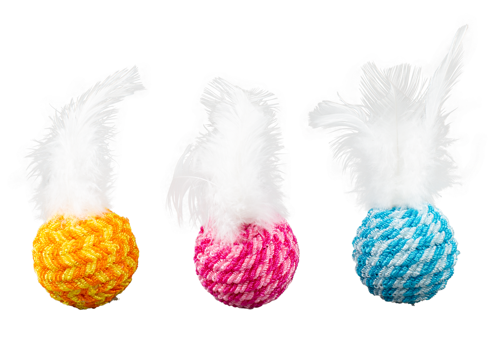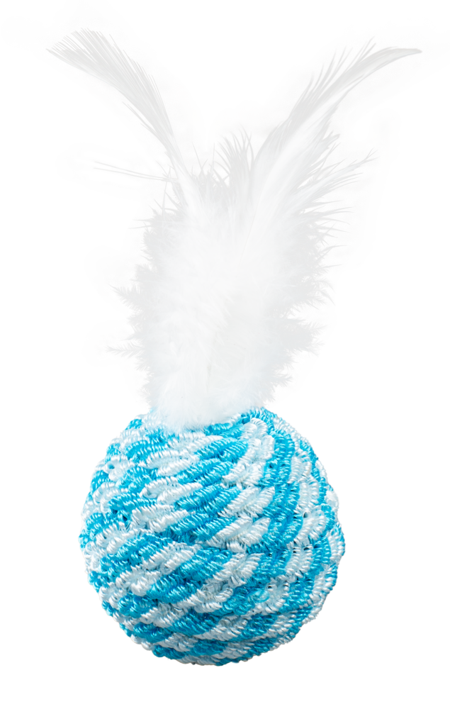 Mit Kunstfedern zum Spielen und der Eigenschaft herumzurollen kann sich auch eine Katze selbst beschäftigen mit dem Spielball.