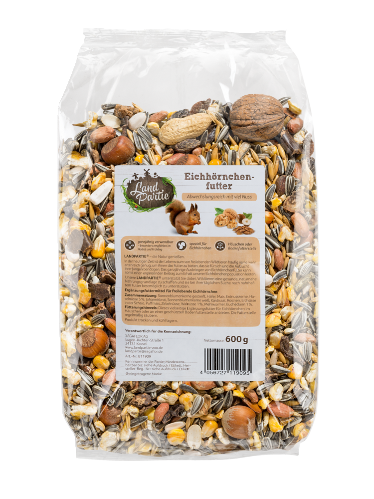 In der heutigen Zeit ist der Lebensraum von freilebenden Wildtieren häufig nicht mehr artenreich genug, um ihnen das Futter zu bieten, das sie für sich und die Aufzucht ihrer Jungen benötigen. Das ganzjährige Ausbringen von Eichhörnchenfutter kann somit einen ergänzenden Beitrag zum Erhalt unserer Eichhörnchenpopulation leisten. Unsere LANDPARTIE® unterstützt Sie dabei, Wildtieren eine gesunde, naturnahe Nahrungsgrundlage zu schaffen und sie bei ihrer täglichen Suche nach nahrhaftem Futter bestmöglich zu unterstützen.- ganzjährig verwendbar