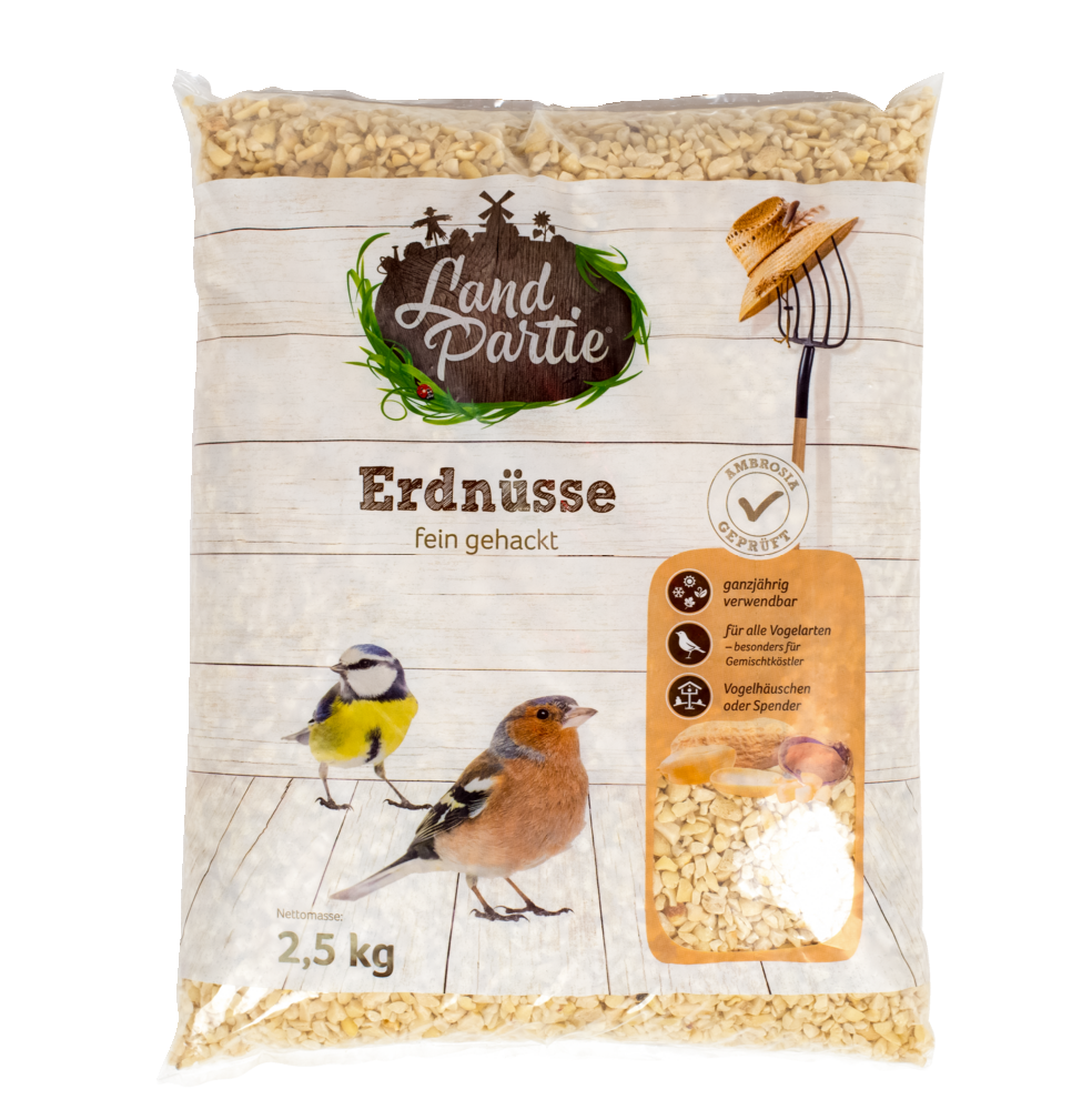 Hochwertige schalenfreie LANDPARTIE® Erdnüsse sind bei Wildvögeln sehr beliebt. Sehr reich an Nährstoffen dienen sie im Herbst und Winter als Energie und Kraftspender und im Frühling undSommer unterstützen sie die Aufzucht der Jungtiere. Die kleinen Erdnuss-Stückchen sind ohne Hautschale und hinterlassen keine Rückstände. Sie stellen damit in jeder Hinsicht ein besonderes Extra dar.