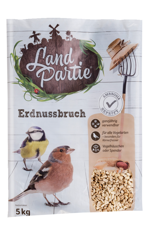 Die Landpartie Erdnüsse sind bei Wildvögeln sehr beliebt. Sehr reich an Nährstoffen dienen sie im Herbst und Winter als Energie- und Kraftspender und im Frühling und Sommer unterstützen sie die Aufzucht der Jungtiere. Die kleinen Erdnussstückchen sind ohne Hautschale und hinterlassen keine Rückstände. Sie eignen sich auch ideal zur Fütterung auf Terrassen und Balkonen.